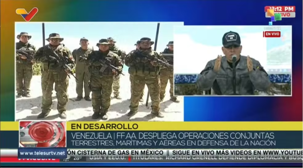 “Faz cinco semanas que a Venezuela foi ameaçada. O que fizemos nesse período? Unir, empoderar e treinar o povo venezuelano, e defender a nossa verdade. Muitos da mídia continuam classificando como tensão… Não é uma tensão. É uma agressão em todas as linhas: judicial – quando nos criminalizam -, política – com suas ameaças diárias -, diplomática e militar. E a Venezuela está, protegida pelas leis internacionais, para responder a essa agressão. Eles não estão lutando pela paz. Eles usam uma mentira como desculpa para justificar uma escalada militar e um ataque criminoso contra a Venezuela”, defendeu.